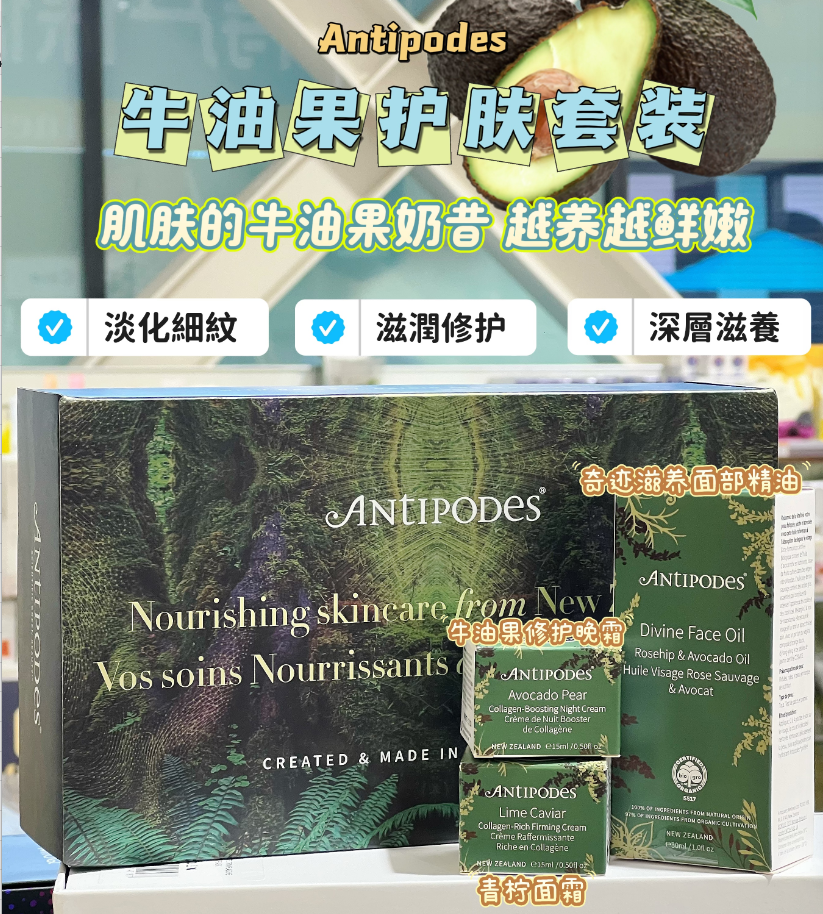 产品名称 : | Antipodes 牛油果护肤套装(面霜+精油+晚霜) |