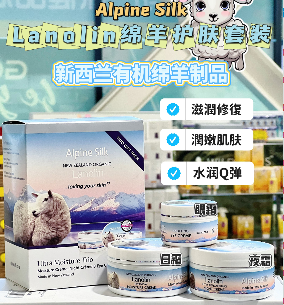 产品名称 : | Alpine Silk 绵羊油护肤套装(眼霜+日霜+晚霜) |